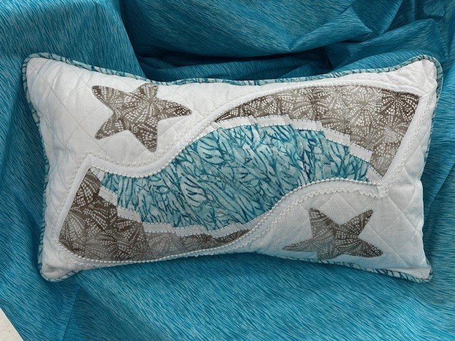 | Requirements: | Sewing machine with accessories. Rotary cutter and mat. Rotating cutting mat (optional) 28mm and 45mm. Cutting ruler to use with rotary cutter. Magic Ultra Grip Pins – Fine (or pins that have tops that can be ironed). Blue water-soluble fabric marking pen. 505 spray adhesive. Water soluble thread (for starfish). Polyester Monofilament thread (clear for pearls) Sulky 30wt cotton thread #1071. Floriani embroidery thread #PF376 Size 80 Universal needle and Size 100 Topstitch needle. Clover Bias tape maker #12, Scissors large and small that you use all the time. Any sewing notions you love and use all the time. For your machine: Zipper foot. 1/4” foot. Open toe foot. Pearl and piping foot if available for your machine. Your regular sewing foot. Extra bobbins for your machine. |